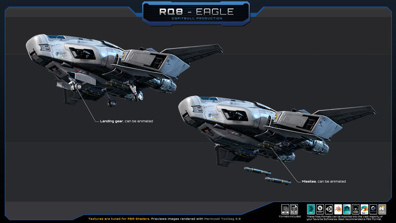 Set of one SF Space/Aircraft (FBX model). No animated parts, LOD or FX. Separate landing gear, bay doors and Missiles. Can be animated, (Thrusters Engines are separated), check all previews, descriptions and video for full details before buying.