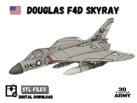 DOUGLAS F4D SKYRAY . It was in service for a relatively short time (1956–1964) and never entered combat but it was the first carrier-launched aircraft to hold the world's absolute speed record at 1211.744 km/h and the first US Navy and US Marines corps fight that could exceed MACH 1 in level flight It's very original and beautiful with his delta wing and equiped with external fuel tank , missiles and rocket pod a small PDF guide is provided to help you to print your model and to assemblr it correctly Take a look to my new Facebook page her : https://www.facebook.com/3DPrintedARMY like it and follow me for lot of new models and my Pinterest page here https://www.pinterest.fr/3DprintedARMY/_created/