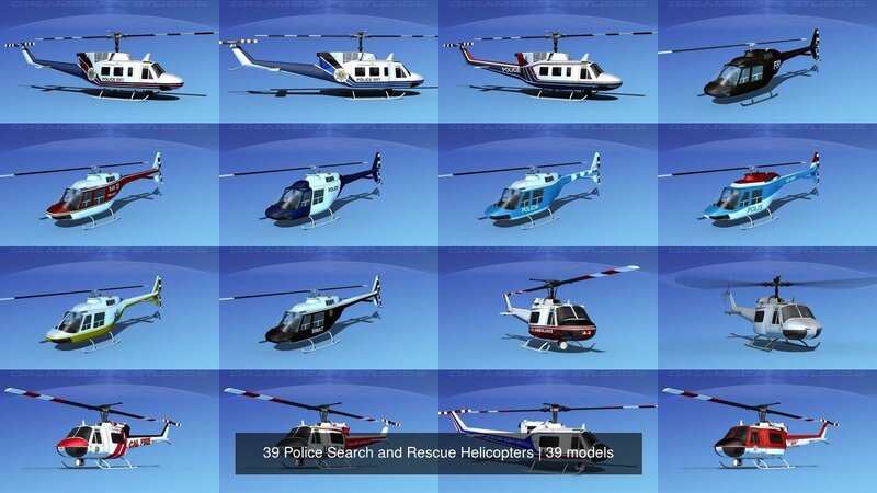 These 39 copters are originally built in Max 13 near to scale (within 3-4% of scale). Models are available in several formats for a wide variety of end users. Exported formats (3ds, lwo and obj) are prepared well to work correctly with every standard modeling software. Compatibility level with other software’s may be limited. Models are textured with multiple HD maps and provide a good realistic rendering when lighted and animated properly. Previews were rendered using 3dsmax standard scanline. Copters include many animateable features. The main rotor, tail rotor, doors, hoist and spotlight are animateable. Much detail is included. Some models include light weight passenger seating while others include empty cargo space. Cargo doors, auxiliary and flight crew doors can be opened or removed or animated. Some models have animated rotor and tail-rotor. The side loading doors and crew doors can be closed and opened to reveal some good detail in the cabin and cockpit on UH-1B Iroquois, also the pilot and copilots seat include the armor and controls and the instrument panel is viewable from outside of the model. These models are built to be used in in-flight or airport ground animations and video or simulation, also to populate an airport scene.