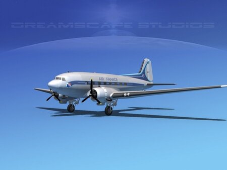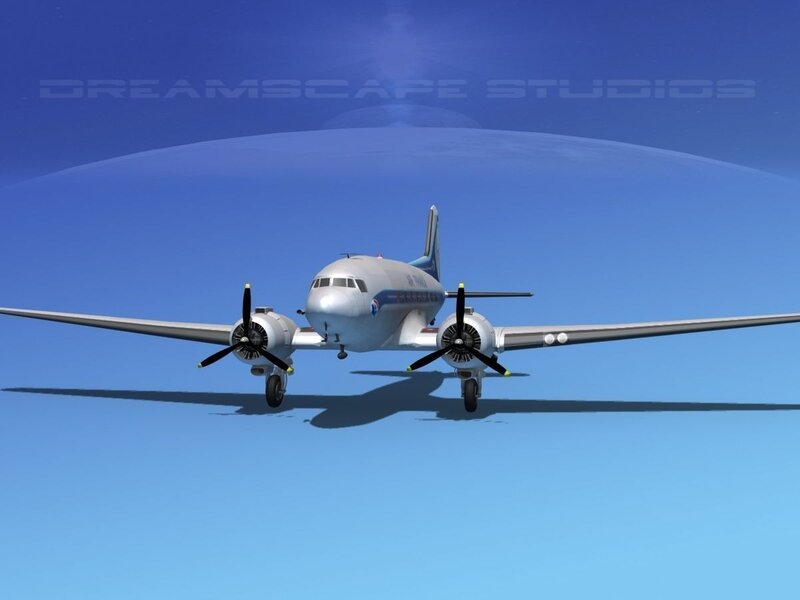 Dreamscape DC-3 was built near to scale and in good detail. It has a great deal of engine detail. The propellers, landing gear elevators, ailerons, rudder and flaps are animateable. It is fully textured and comes in 12 different formats and in many different airliners liveries.