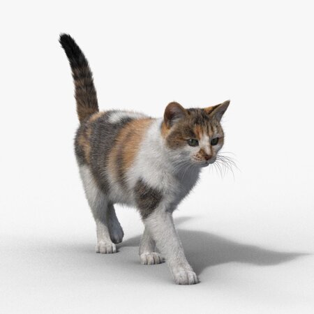 This is a calico cat models have multiple 4K textures (partial UDIM maps), fur, rigging, and 3 animations. The fur maps and skin maps are made separately for a better result. The models are rigged after real bone structure, and with fine facial rigging. They are made with Blender and Cycles renderer at a real-world scale.