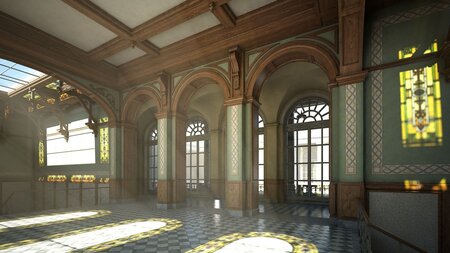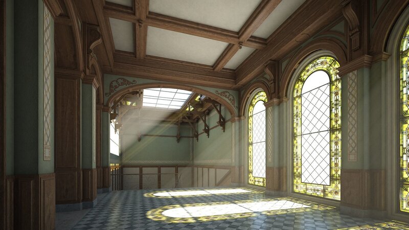 All objects have names and are organized with layers according to type of object and material. The model is composed of different objects: arches, columns, entablatures, vaults, etc. The model uses vray materials.