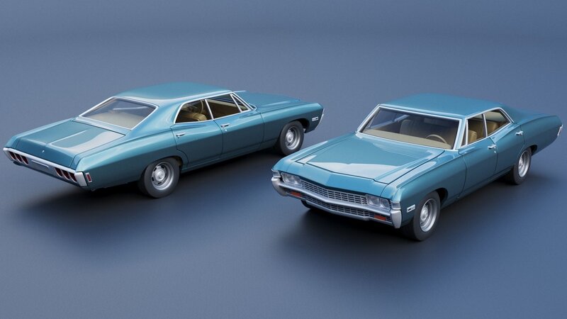 The model includes •Body •Body without hood •Hood •Body divided into 3 parts •Grille •Engine •Interior •Chassis •Wheels •Tires •Windows and glass for headlights and taillights