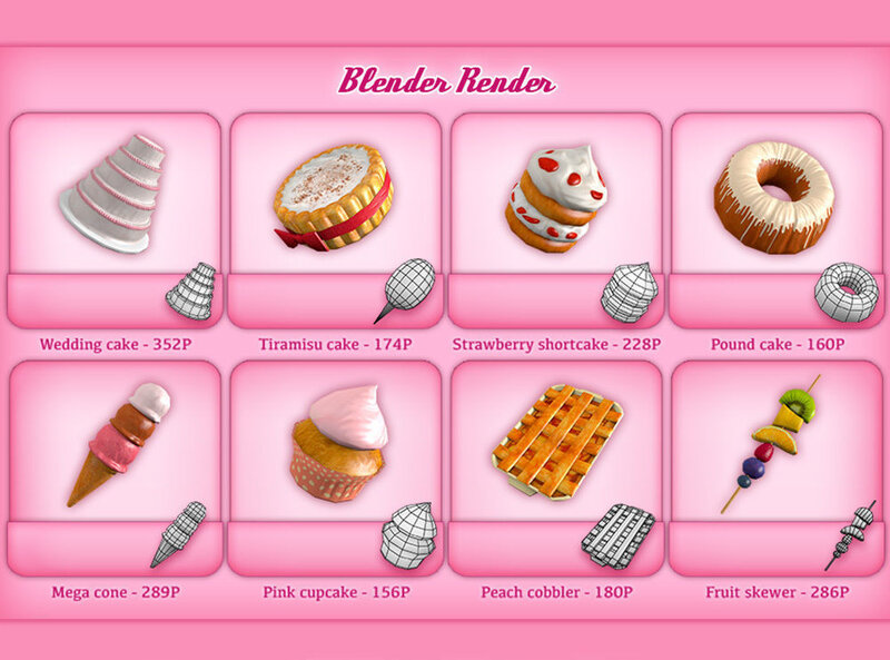 Items (polygons): - Apple pie (176P) - Banana split (545P) - Birthday cake (273P) - Brownie (22P) - Cake (144P) - Cannoli (124P) - Cheesecake (80P) - Cherry pie (160P) - Chocolate cake(144P) - Chocolate mousse (274P) - Chocolate tart (128P) - Cinnamon roll (96P) - Cookie (48P) - Cotton candy (192P) - Crumble (200P) - Danish (98P) - Donut (192P) - Eclair (174P) - Fruit skewer (286P) - Ice cream cone (132P) - Ice cream sandwich (126P) - Ice cream treat (250P) - Jello (96P) - Jelly roll (32P) - Keylime pie (242P) - Lime cupcake (148P) - Macarone (132P) - Mega cone (289P) - Melon salad (238P) - Melty moment (180P) - Meringue (60P) - Milkshake (327P) - Mini tart (204P) - Pancakes (138P) - Panna cotta (88P) - Parfait (184P) - Peach cobbler (180P) - Pink cupcake (156P) - Popsicle (100P) - Pound cake (160P) - Pudding (107P) - Rainbow cupcake (132P) - Red velvet cake (400P) - Strawberry shortcake (228P) - Sundae (312P) - Tiramisu cake (174P) - Trifle (304P) - Waffle (128P) - Wedding cake (352P) - Whoopie pie (156P)