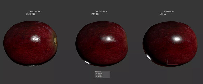 The grape model is presented as a single mesh in 3 subdivision levels: low, mid, and high. Meshes are quad-based. The polycounts are 734, 11K, and 751K. The high-detail model is included in .max, .fbx, and .obj formats.