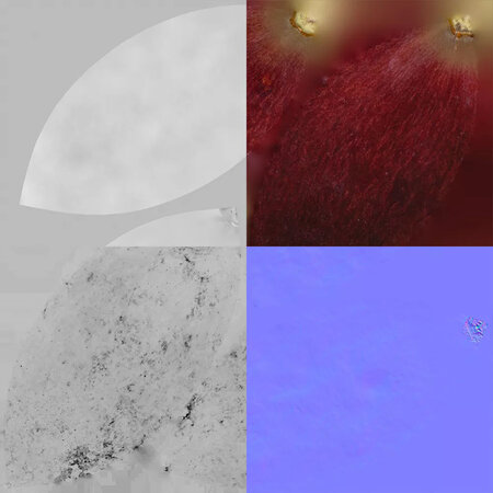 5 maps are supplied with this model. Textures supplied are in JPG format and are in 2K, 4K, and 8K resolution. The texture maps include diffuse, glossiness, roughness, normal, and displacement(tif). The grape model is uvw unwrapped. 16K diffuse included.