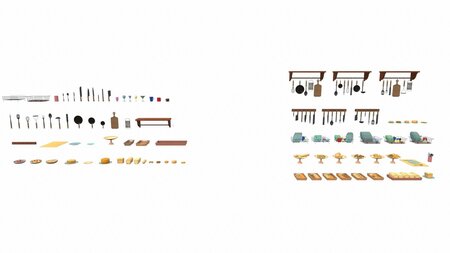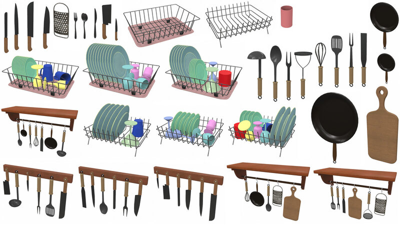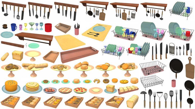 The cartoon kitchen props collection package consists of 3 basic textures (one material - one set of textures). All models are available separately in the archive.