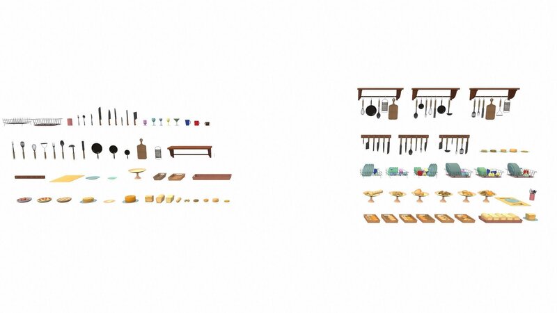 A collection of 3D models, which consists of cartoon kitchen props, 91 base models (58 main models).