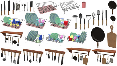 The model cartoon kitchen props collection is located in zero coordinates. UVW mapping created, all textures are in the zip archive The model cartoon kitchen props collection was created in 3Ds Max and textured in 3D coat. Previews of the model cartoon kitchen props collection are made in the Marmoset Toolbag program.