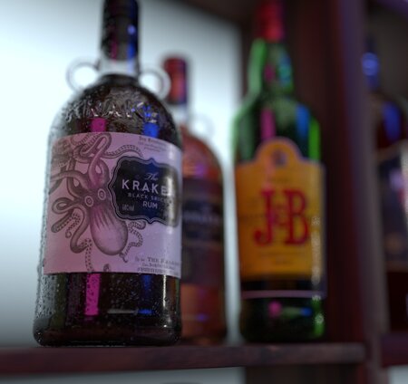 The UV Maps are not baked for maximum quality. As such, this collection is best opened in Blender. All non-label textures and imperfections are procedural. Although the designs can sometimes have busy areas, the majority of these bottles are low-medium poly, with carefully reduced topology to have no redundant faces. These bottles are designed for medium to extreme close-up shots with high levels of realistic detailing. Each item is carefully named, along with materials, for everyone's sanity. There are ngons in the mesh, however they do not cause any shading issues. Poly count is average model. It can vary from bottle to bottle. For instance, Kraken is 6500 verts. Note that you can just download and import the .glb, the textures folder isn't necessary to download as the textures come with the .glb file.