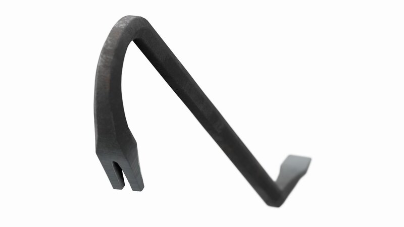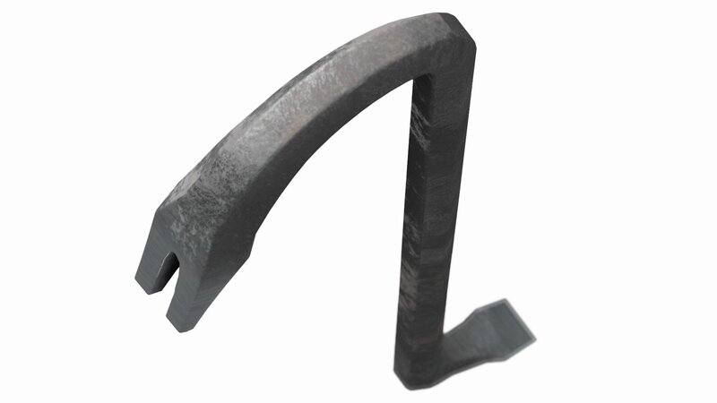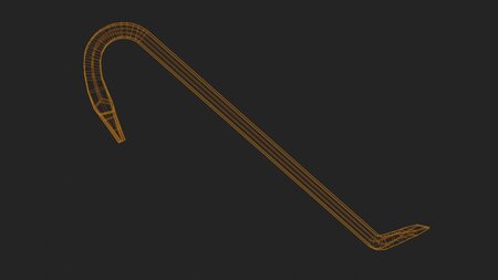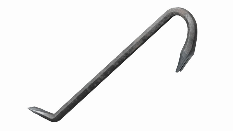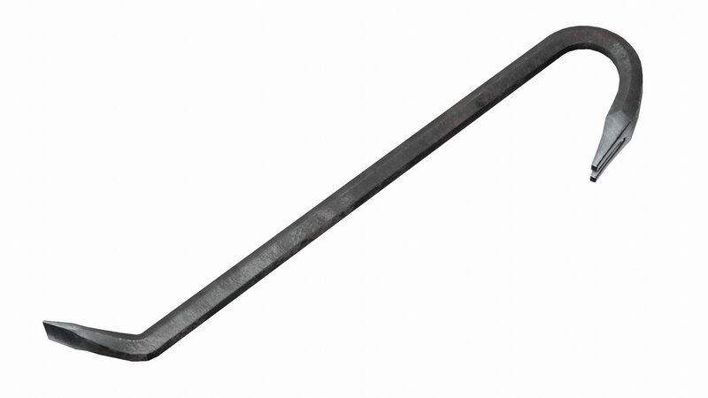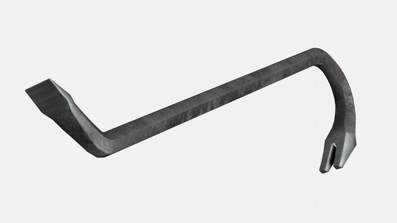 A 3D models of a steel crowbar. Low poly and suitable for games, the model is PBR textured with a detailed metallic surface material.