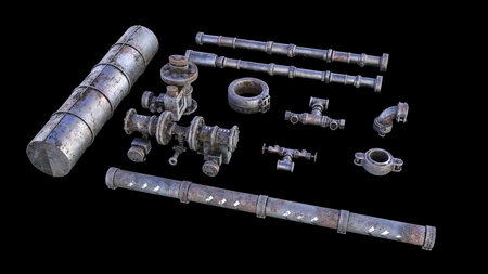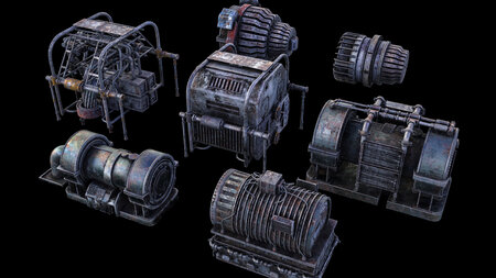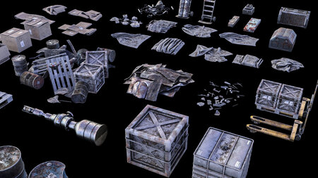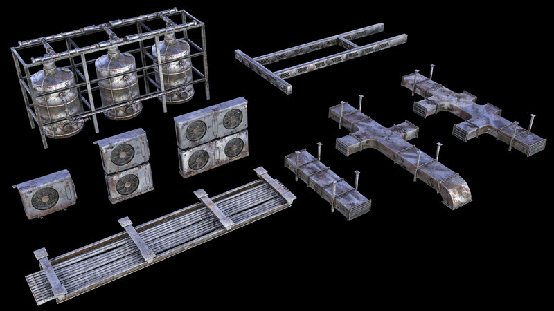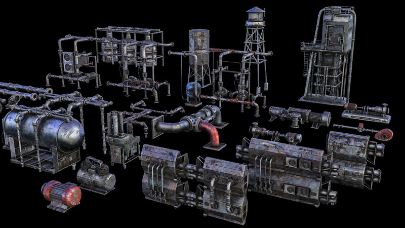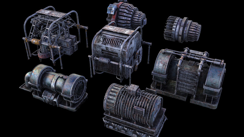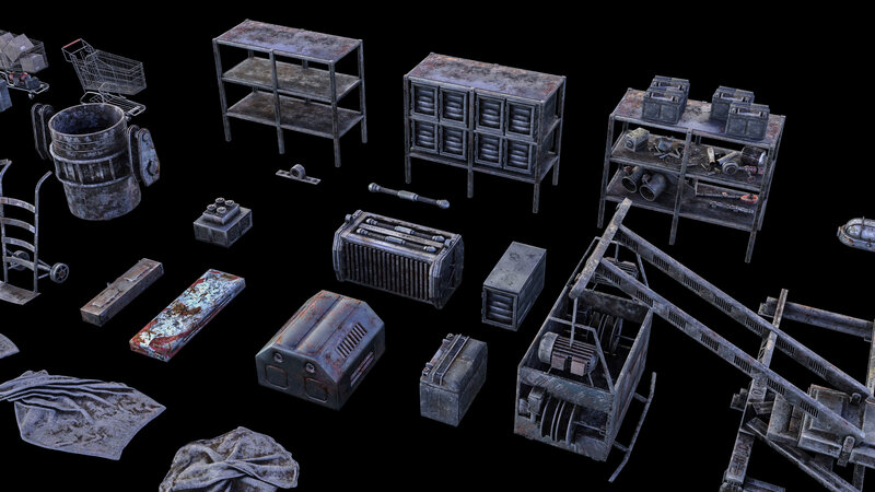 Each model has PBR textures (Albedo, Gloss, Roughness, AO, Displacement), and two texture sets, worn and dirty. The dirty texture set is the same as worn, but with dirt effects applied. The texture set on the images is the dirt set.