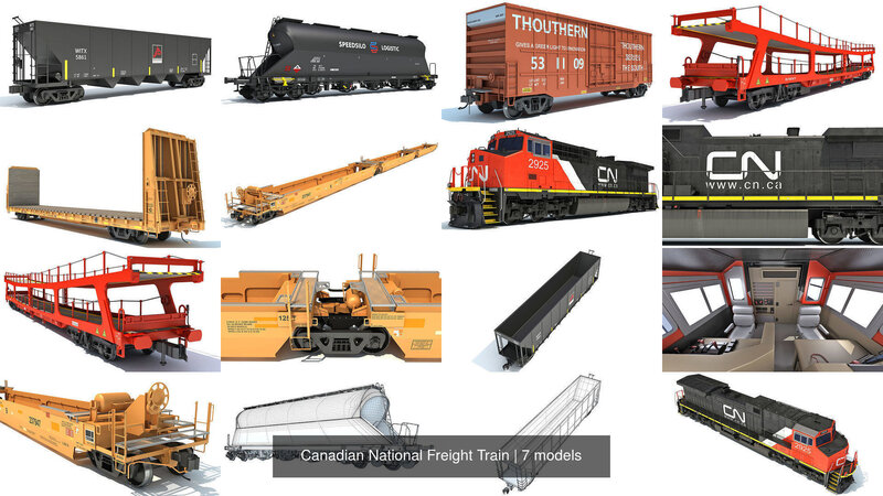 High detailed Canadian National locomotive with 6 railroad car collection.For additional info, turntables and more preview renders, or if you want to get separate models, please search our catalog.