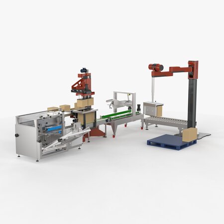 This drawing is the unpacking and sealing scheme of a food factory. The content is complete, including sheet unpacking machine, power roller, carton opener, packing robot, etc.
