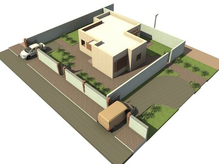 The project is a ground floor villa of 90 m² with garden and parking space.this 3d only describes the exterior of the project. The building is a project on the ground floor + floor with glass shed area the fences. This project can be used as a platform for a children's game. the four-sided housing that overlooks the garden with a parking area for the car. the facades of the project have a simple modern architecture.