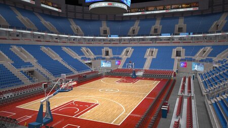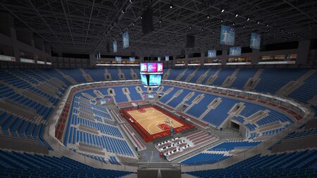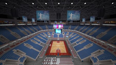 Detailed basketball real-world size arena with 18468 seats, 3 types of terrain, top ads, oval ads, large scoreboard, ball, two levels of VIP rooms and seats, tables, detailed roof construction, and many more... The color of the court, red, blue, and neutral.