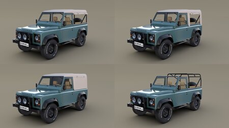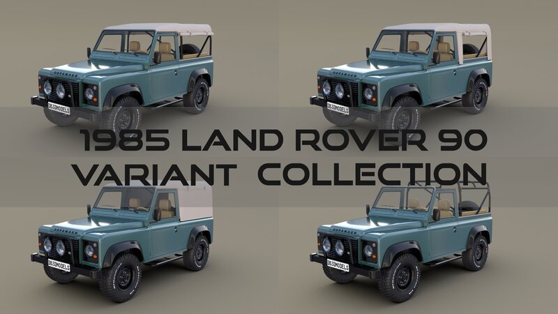 1985 Land Rover Defender 90 with interior 3D Model Collection consisting of 4 variants of the same car, with 4 different tops, as can be seen in the rendered images.