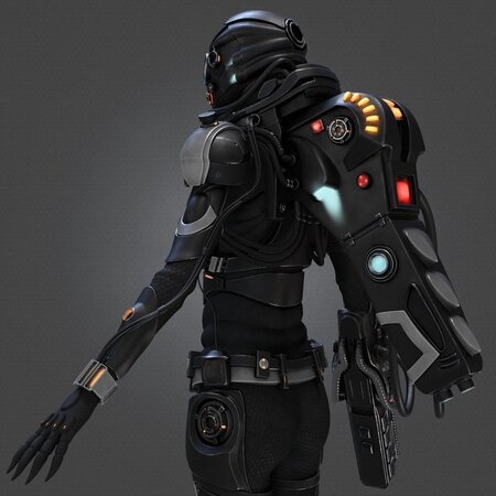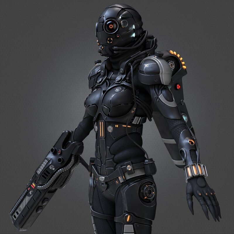 High quality 3D model of a female cyborg, ready for close-up and HD renders. PBR textures. File in the Marmoset Toolbag 2 available.