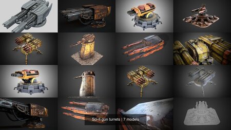 A collection of various gun cannons, from short-range cannons to ship cannons mounted on space destroyers with enormous range and firepower. All models are made with attention to topology and poly-count