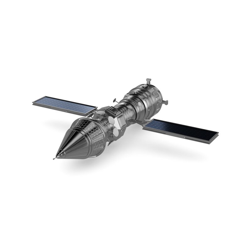 A sleek and metallic flyby spacecraft with a pointed nose cone, covered in solar panels for energy generation, equipped with multiple antennas for communication, and adorned with various scientific instruments protruding from its body, designed for scientific exploration in current timeline.
